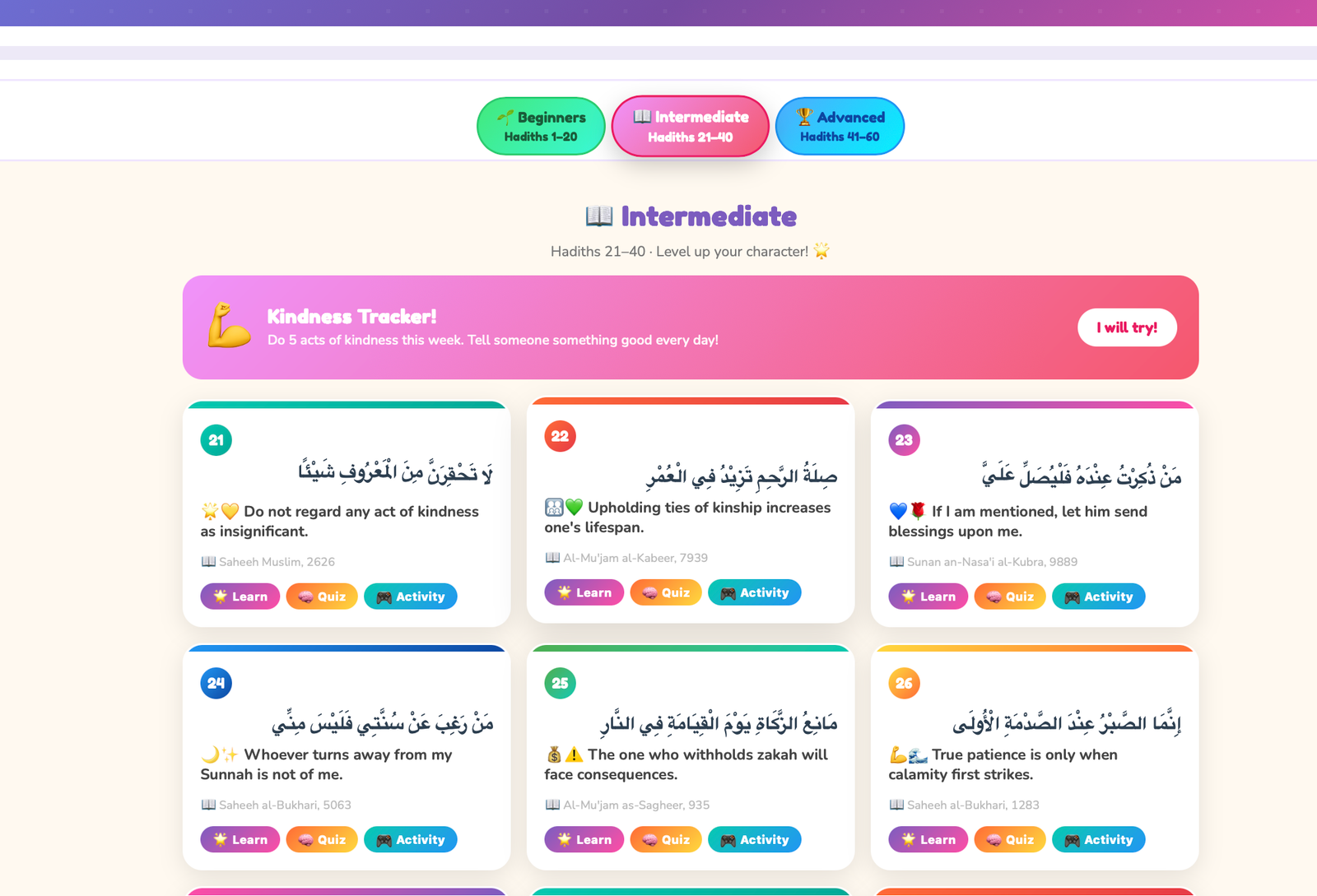 60 Golden Hadiths for Children is a fully interactive online course that takes your child on a journey through 60 of the most important hadiths in Islam. Based on the beloved Darussalam book by Abdul Malik Mujahid, every hadith has been transformed into an engaging digital lesson.