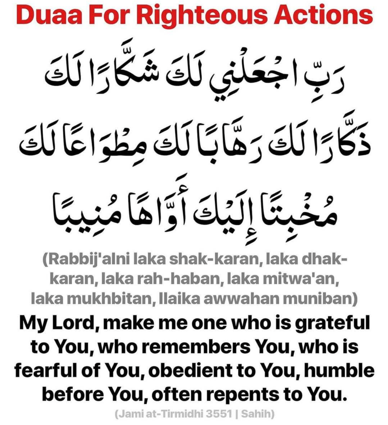 “The Prophet (ﷺ) used to supplicate, saying: “My Lord, aid me and do not aid against me, and grant me victory and do not grant victory over me, plot for me and do not plot against me, guide me and facilitate guidance for me, grant me victory over those who transgress against me. My Lord, make me ever-grateful to You, ever-remembering of You, ever-fearful of You, ever-obedient to You, ever-humble to You, oft-turning and returning to You. My Lord, accept my repentance, wash my sin, answer my call, make firm my proof, make firm my tongue, guide my heart, and remove the treachery of my chest (Rabbi a`innī wa lā tu`in `alayya, wanṣurnī wa lā tanṣur `alayya, wamkur lī wa lā tamkur `alayya, wahdinī wa yassiril-huda lī, wanṣurnī `alā man baghā `alayya. Rabbij`alnī laka shakkāran, laka dhakkāran, laka rahhāban, laka miṭwā`an, laka mukhbitan, ilaika awwāhan munība. Rabbi taqabbal tawbatī, waghsil ḥawbatī, wa ajib da`watī, wa thabbit ḥujjatī, wa saddid lisānī, wahdi qalbī, waslul sakhīmata ṣadrī).”
