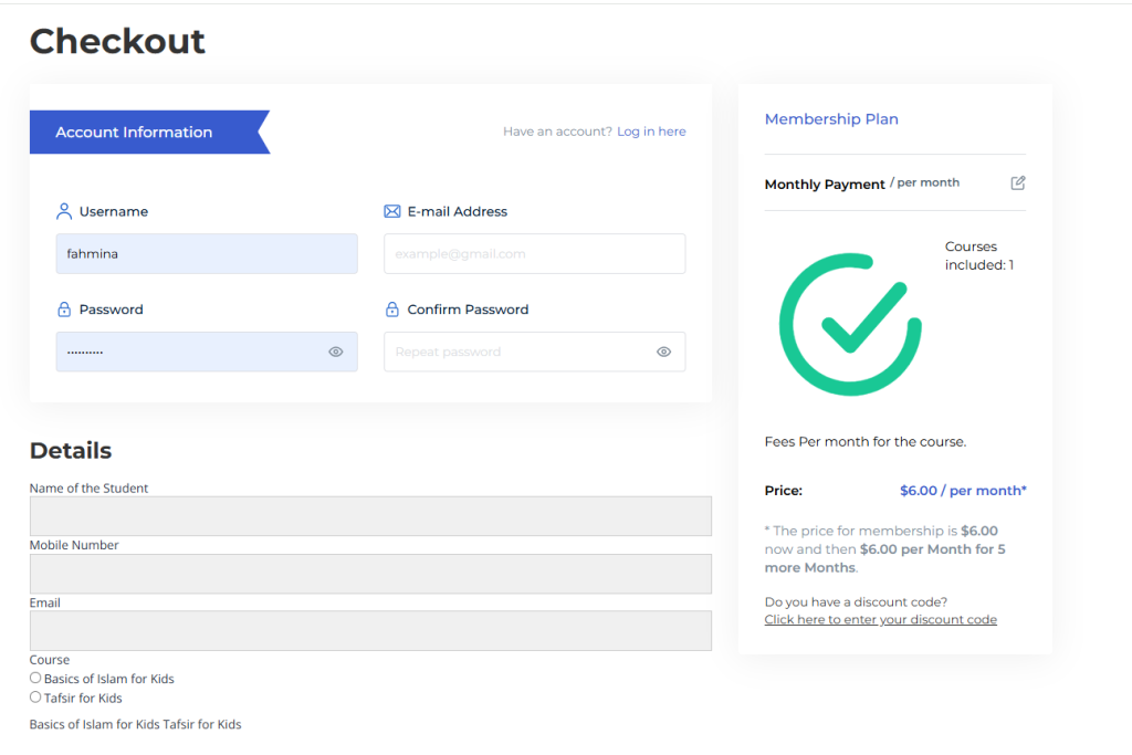 For monthly Payment, Fill your Name, Password, Email address, Password,and the course you chosse. You will be directed to Payment page where you can Pay via Paypal or your debit card,